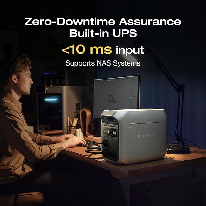 - [Whisper Quiet Operation & 10ms Switching Time for UPS Protection] X-Quiet technology ensures extremely low operating noise of only 30dB at 600W and 40dB at 1 200W load. Whether in a tent or at home, you sleep undisturbed. DELTA 3 Plus operates like a true UPS with a switching time of 10 ms and is therefore ideally suited for NAS systems in home offices, for servers, POS systems in retail and other important backup power supplies, as it prevents data loss due to unexpected power outages